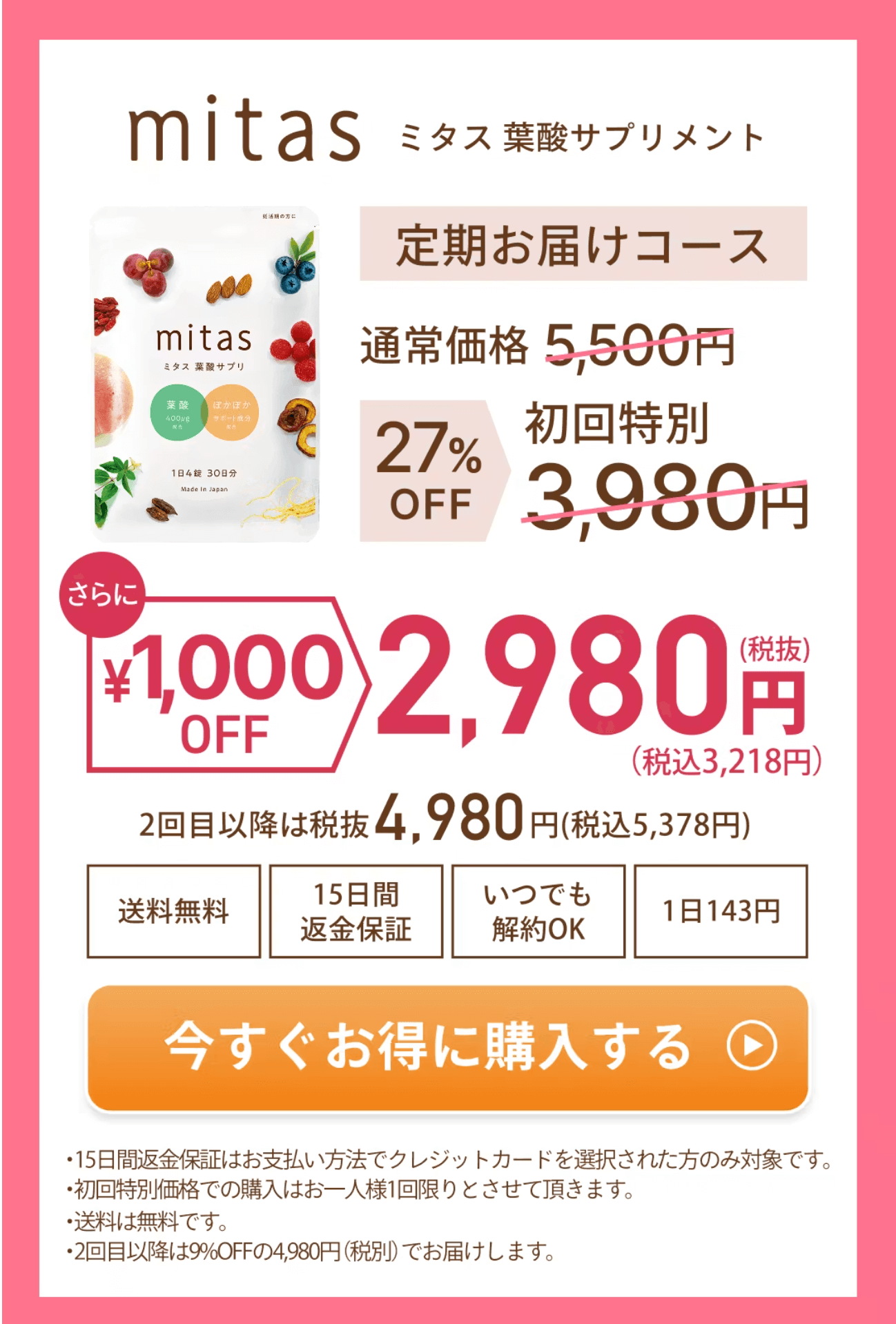 ミタス葉酸サプリ(mitas)が最悪な商品なのではなく、目的や葉酸の摂取量・栄養素を正しく理解することで、妊活・妊娠管理の必要性を実感できます。