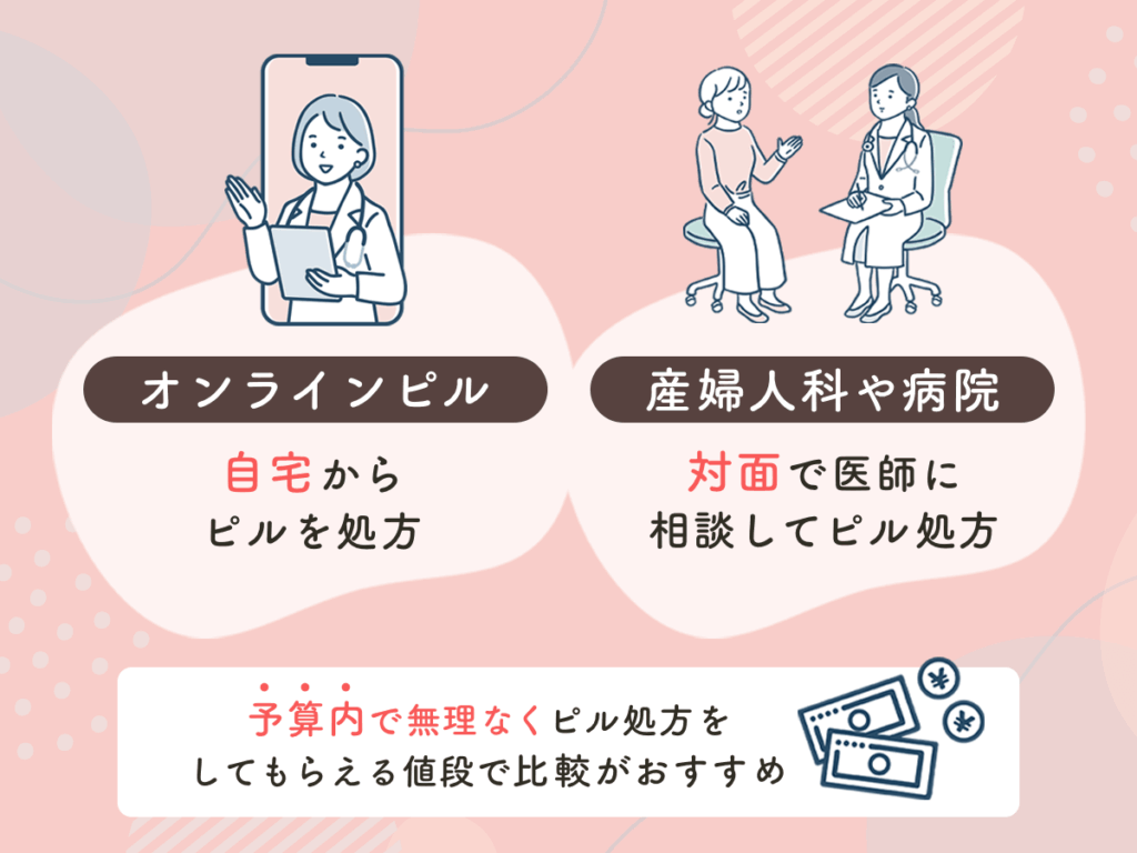 ピルを処方してもらうには、婦人科の病院・クリニックを受診する必要がありますがオンラインピルで処方を行っているサービスもあります。