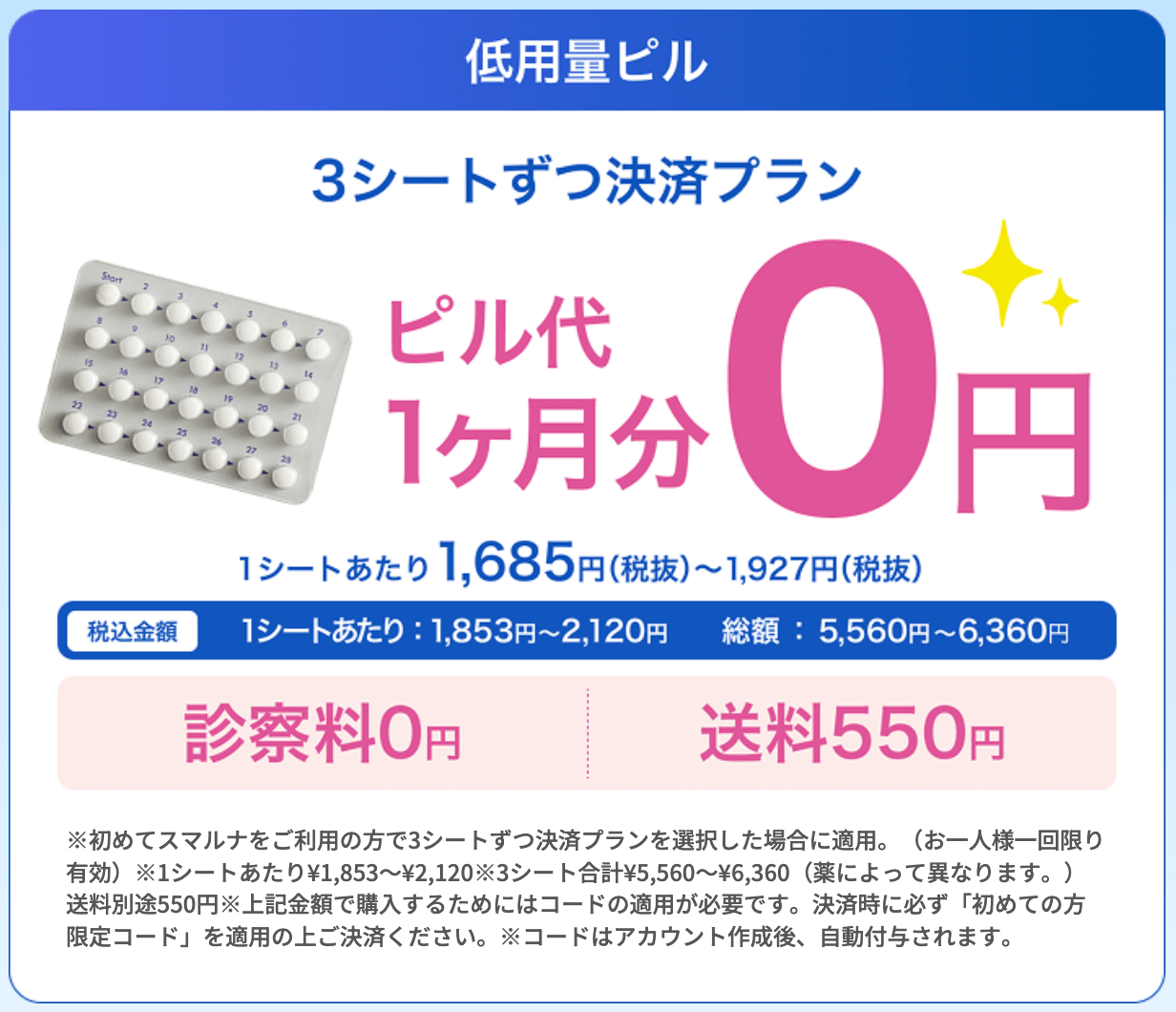 安い値段で処方してもらうには、スマルナの割引クーポンはないものの3シートごと決済プランを選べば1シート分が無料になる低用量ピルプランがあります。